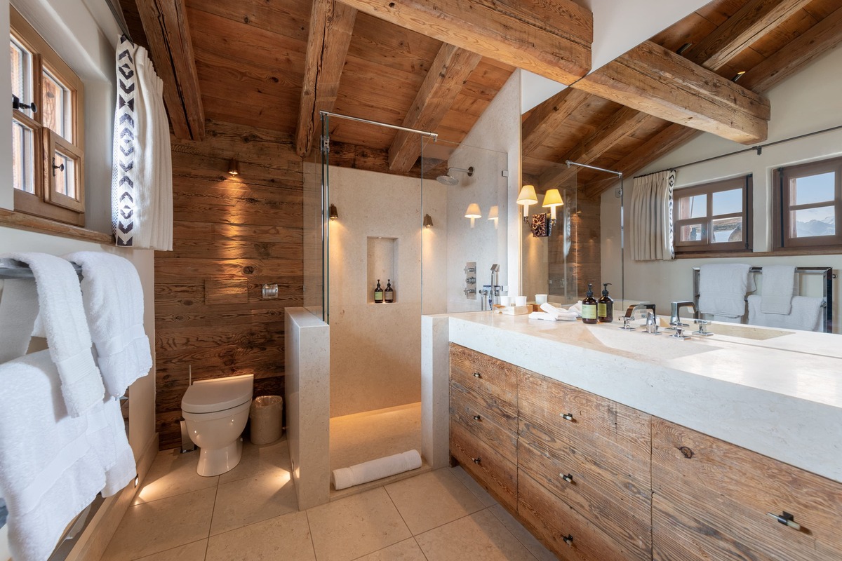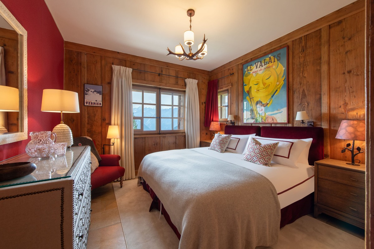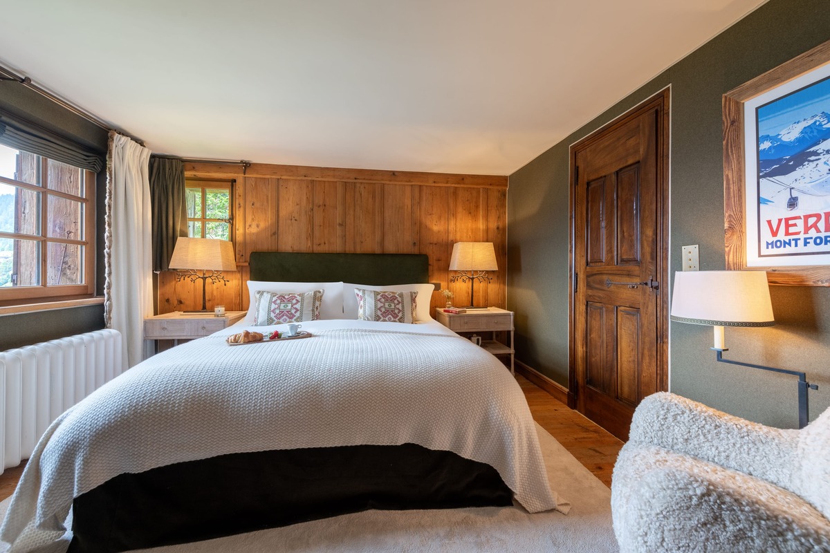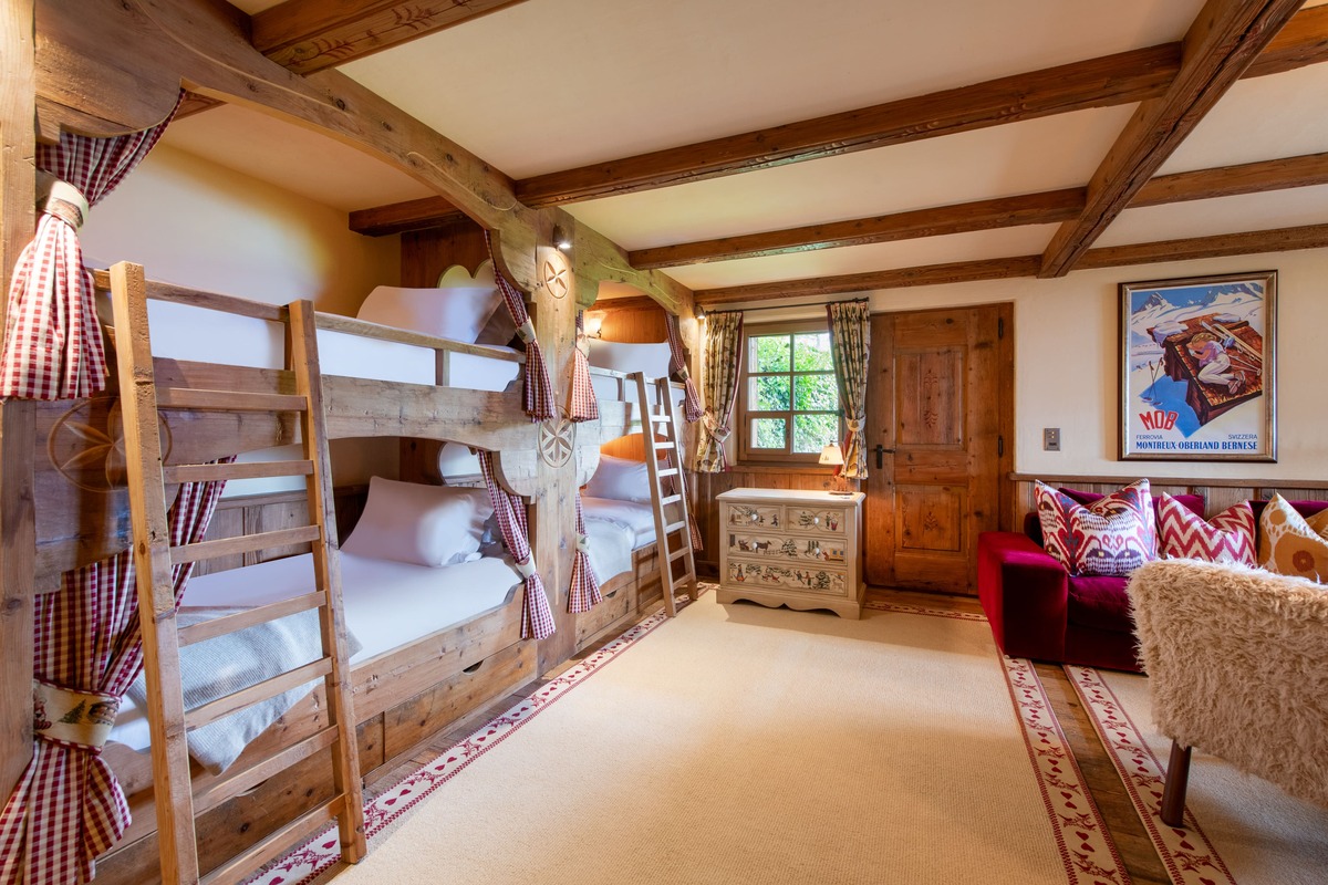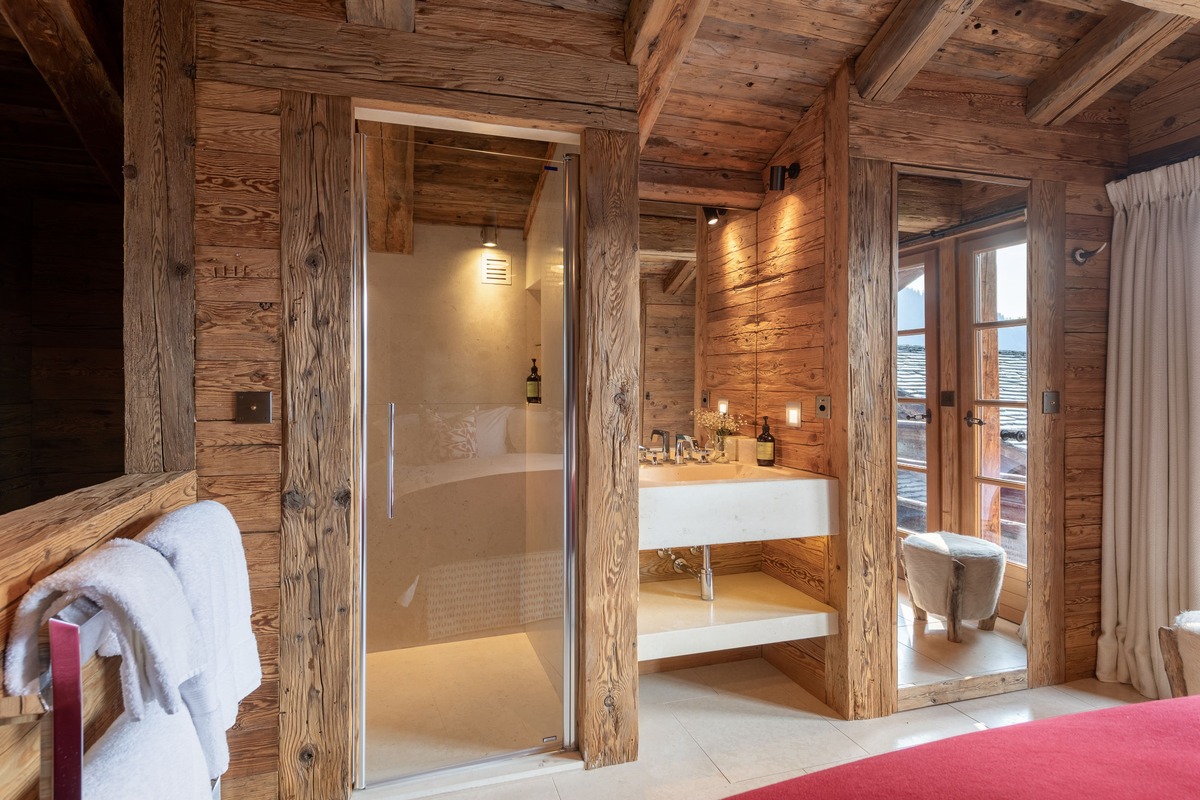 The main chalet offers six en-suite bedrooms, including a master bedroom tucked beneath the eaves with both privacy and panoramic views. There is also a quad bunk room with its own TV corner. The mazot annex provides additional independence, with a double bedroom, bathroom and living area.