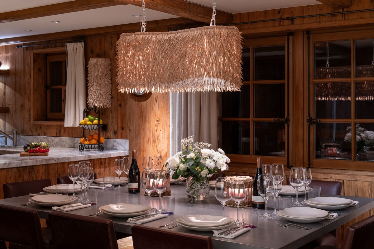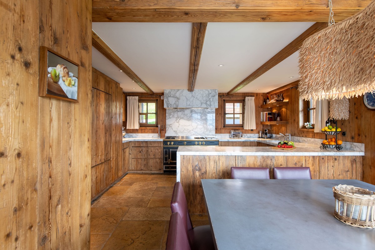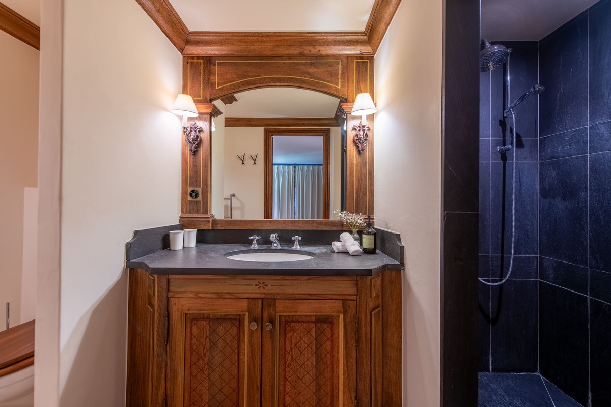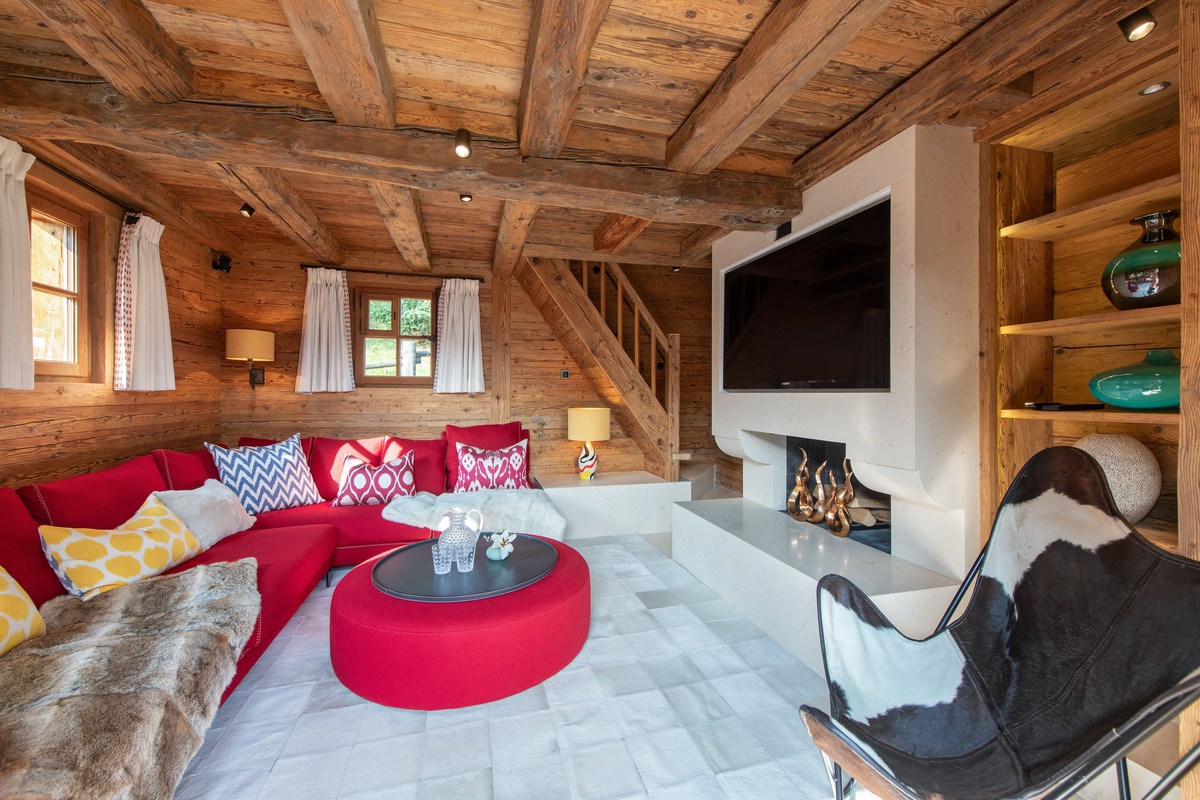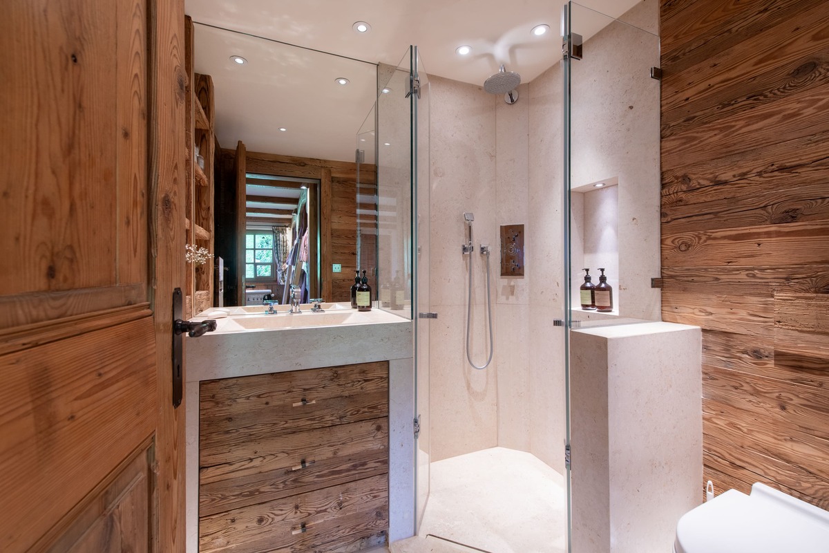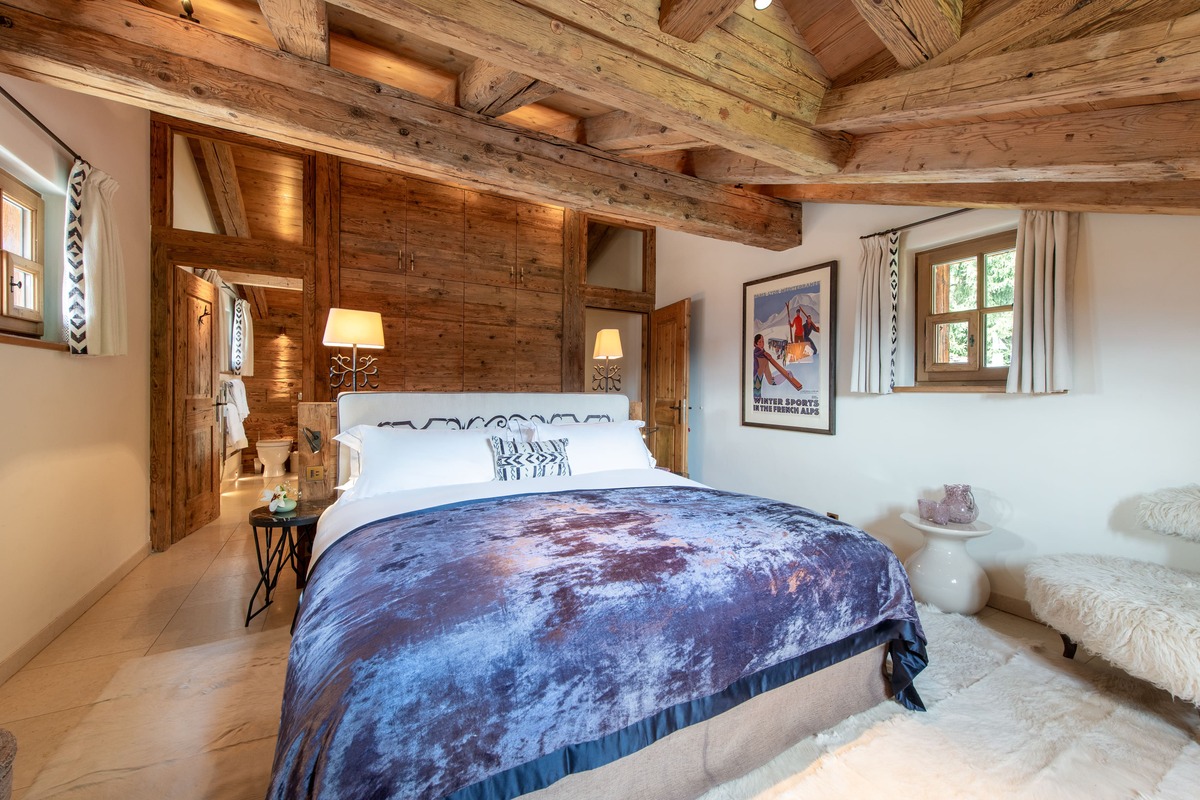 The main chalet offers six en-suite bedrooms, including a master bedroom tucked beneath the eaves with both privacy and panoramic views. There is also a quad bunk room with its own TV corner. The mazot annex provides additional independence, with a double bedroom, bathroom and living area.