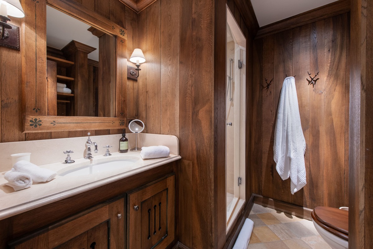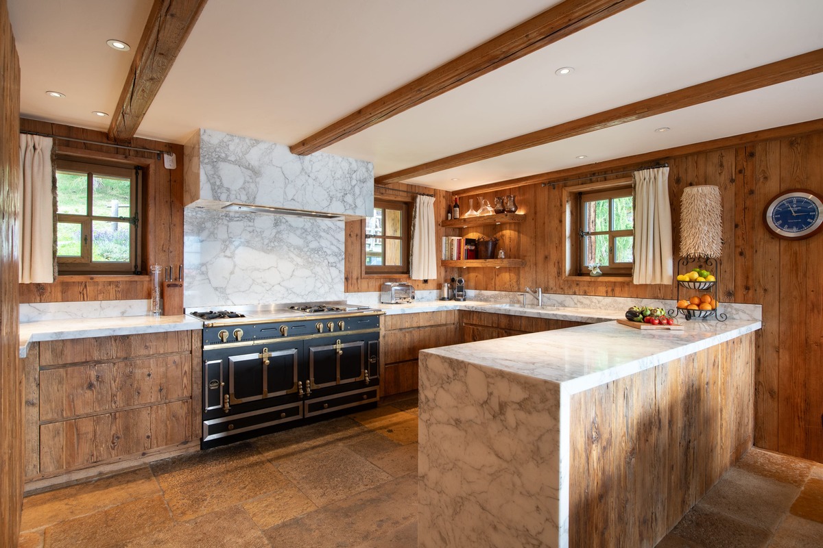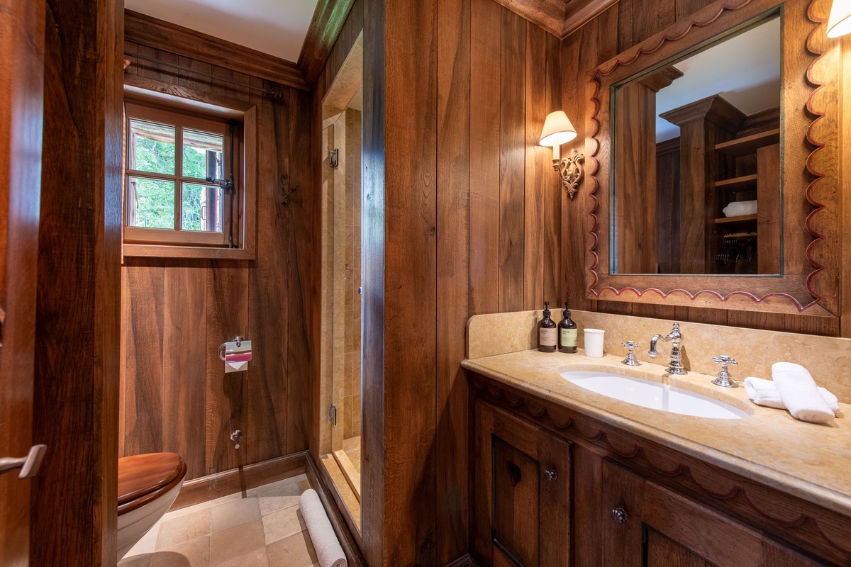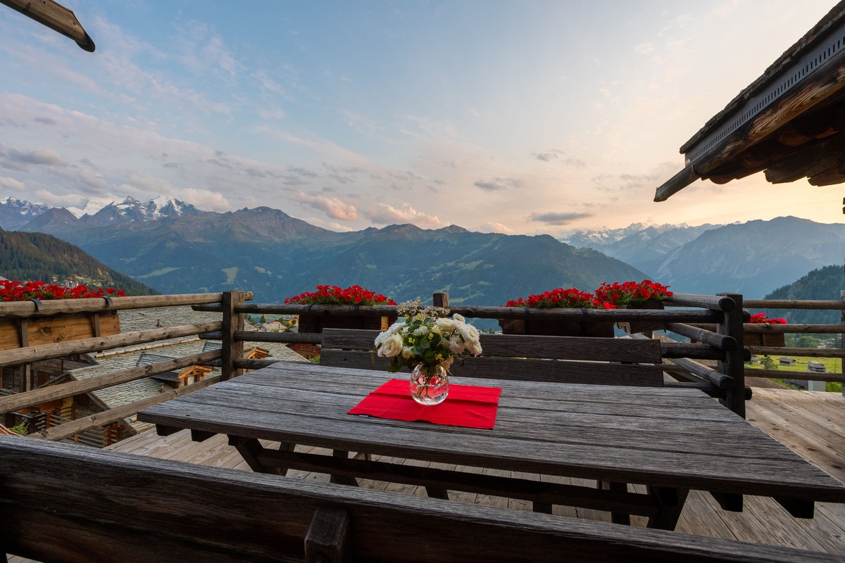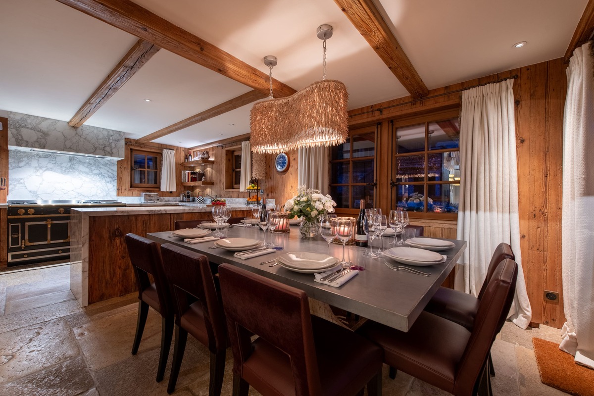 The main chalet offers six en-suite bedrooms, including a master bedroom tucked beneath the eaves with both privacy and panoramic views. There is also a quad bunk room with its own TV corner. The mazot annex provides additional independence, with a double bedroom, bathroom and living area.