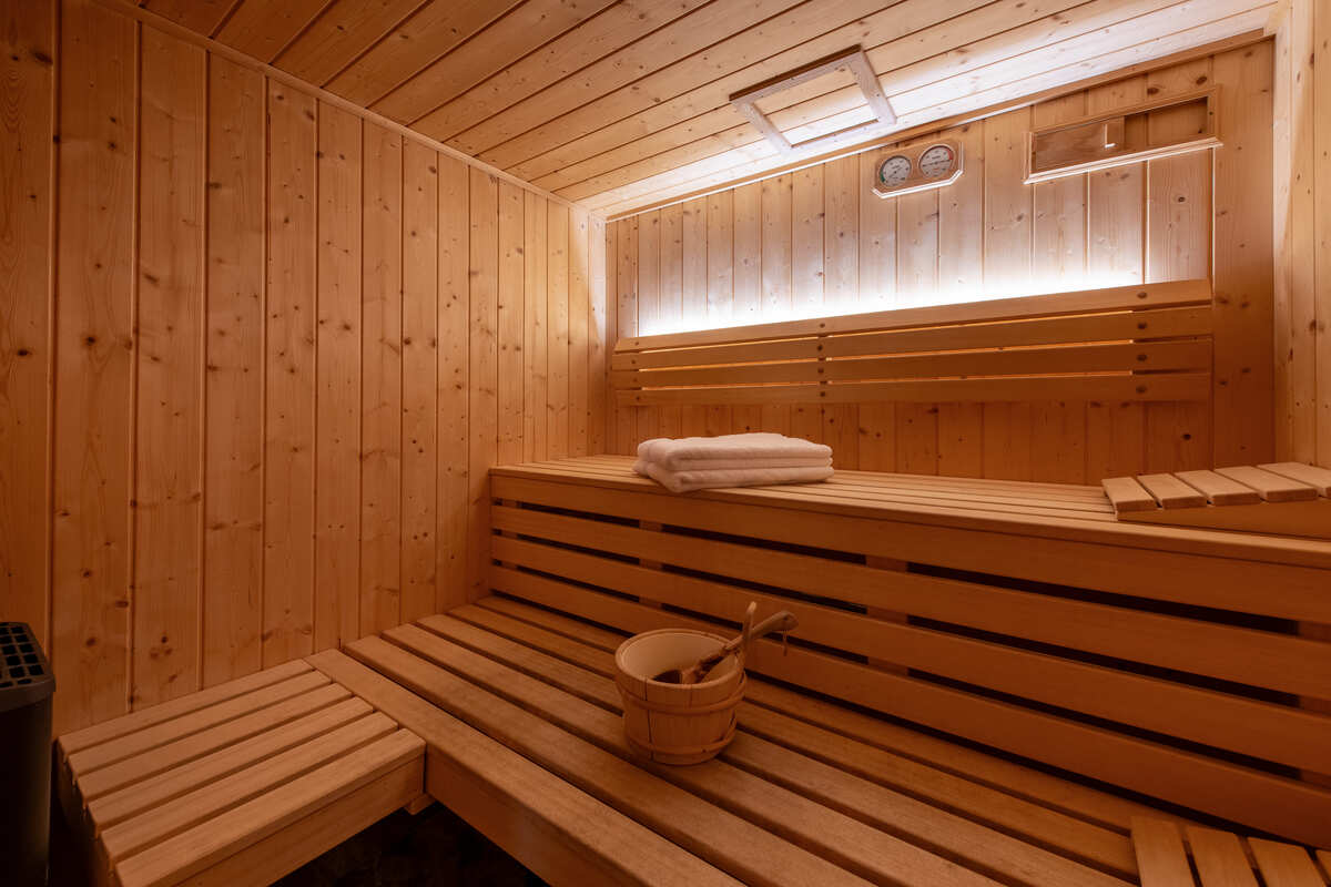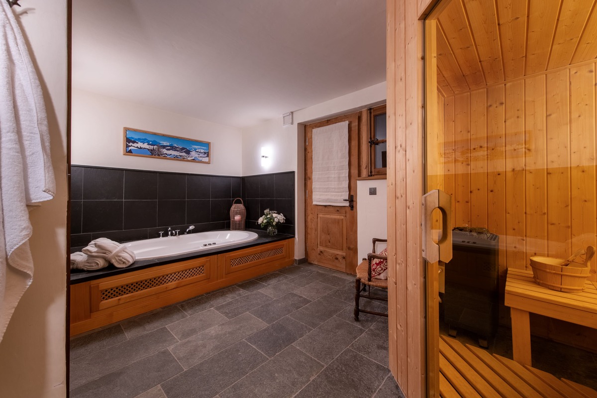 On the ground floor, the wellness area includes a Jacuzzi bath, sauna and rain shower, with direct access to the outdoor hot tub.