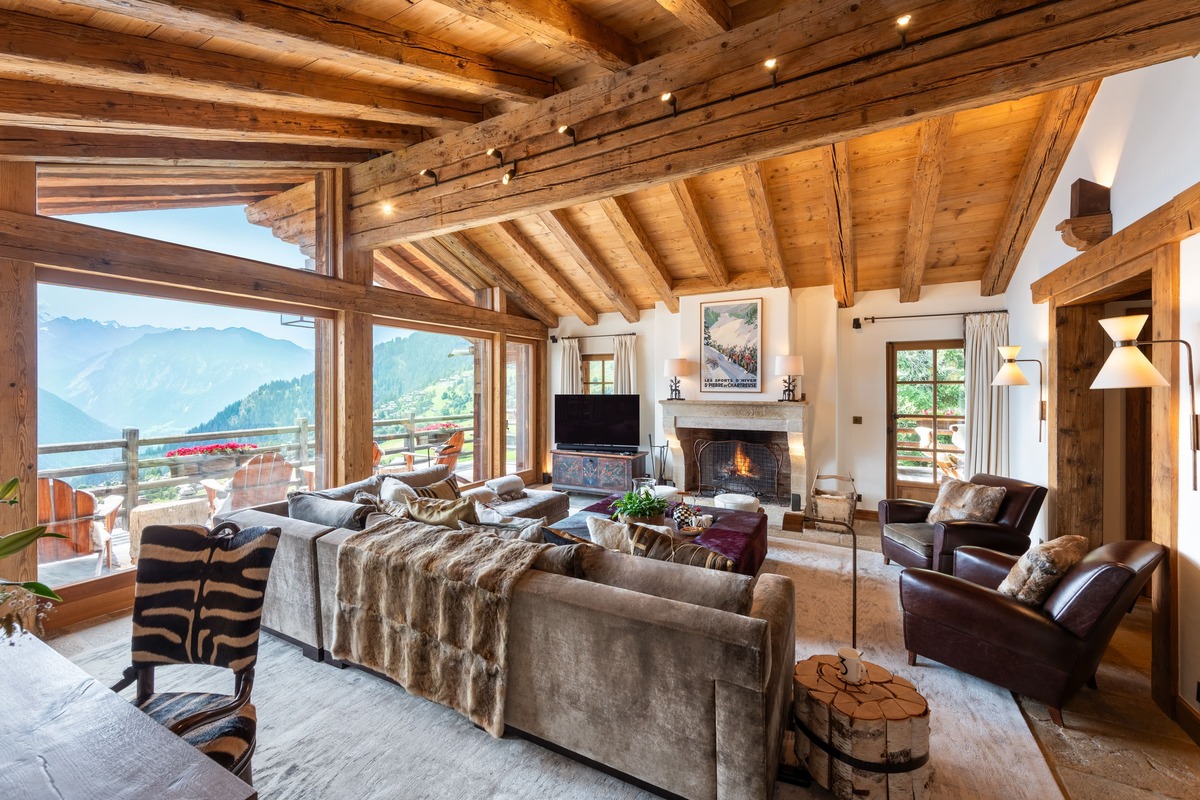 The main living area features floor-to-ceiling windows that frame views of the surrounding mountains. Its open-plan design and integrated sound system create an inviting space for socialising, while the outdoor seating area with a fire pit offers the perfect spot to enjoy the alpine scenery.