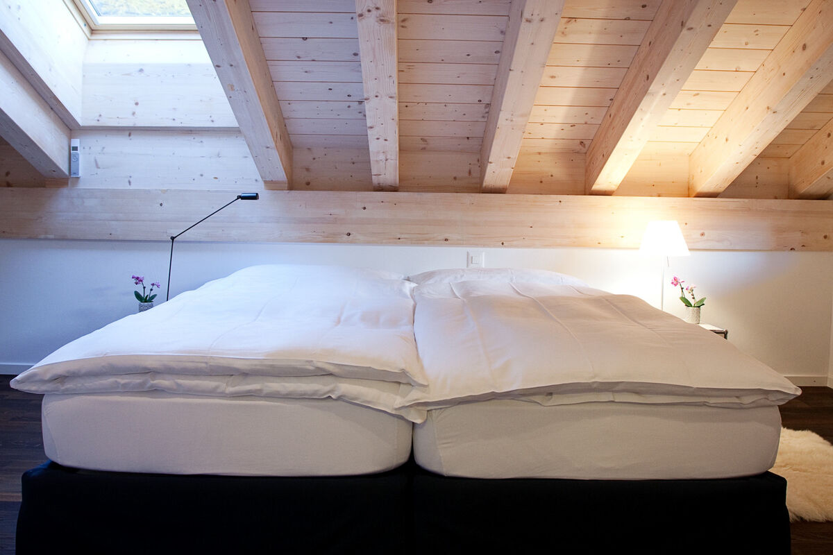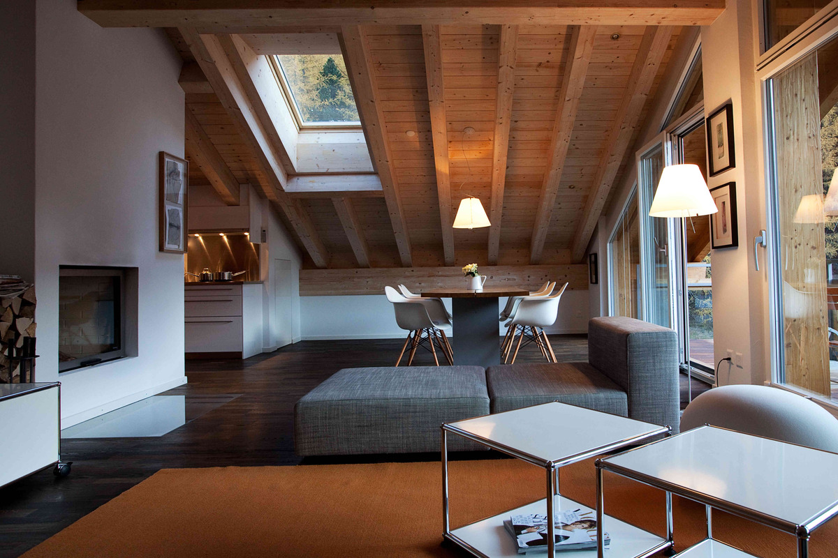 The Penthouse apartment in Chalet Altesse is the jewel in the crown. This 155 square metre property is built under the wooden beams of the building's roof. Guests staying here benefit from the most elevated and best views of the Matterhorn Mountain and the wooden beams lend the apartment a 'real' chalet experience.