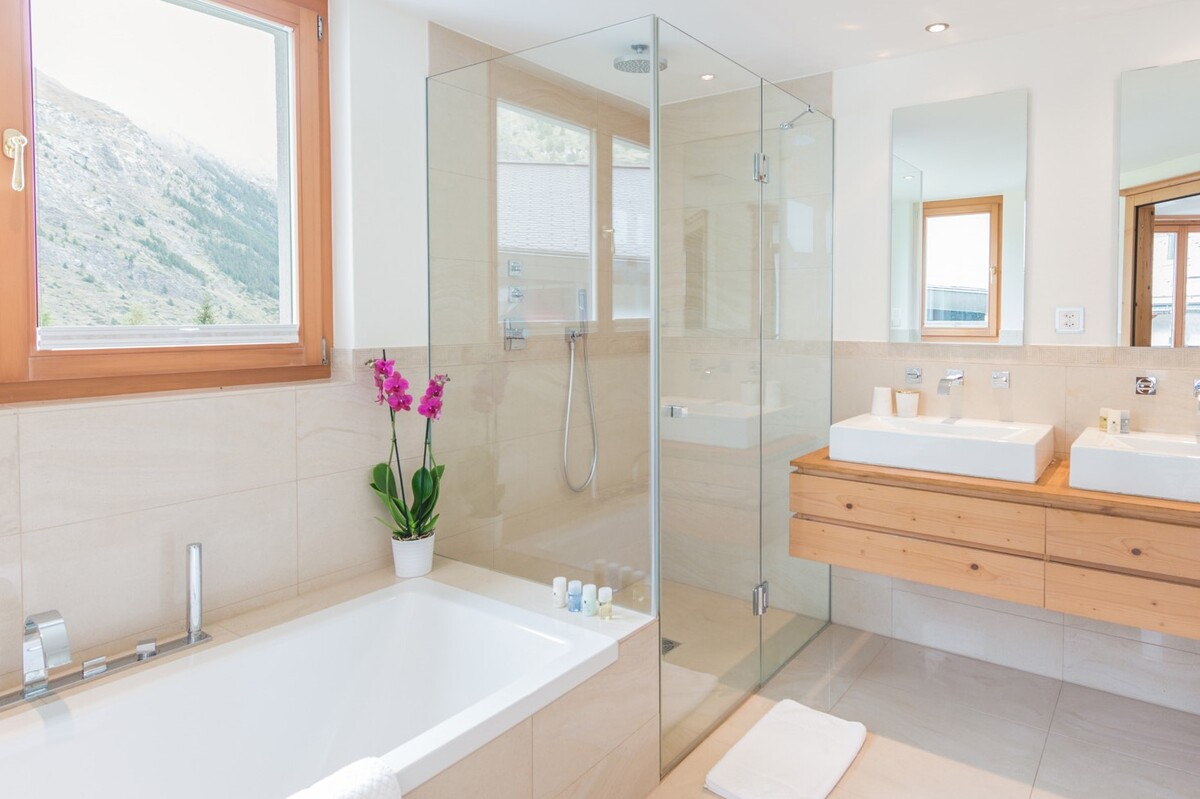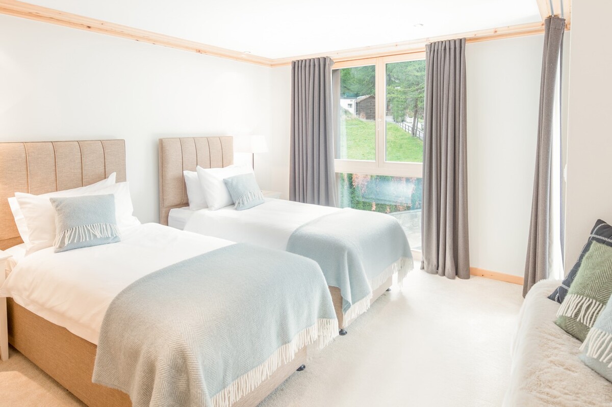 There are three double bedrooms and one twin bedded room in the chalet. The three doubles have en-suite bathrooms and the twin room has a loo just next door. Three of the bedrooms have excellent views over the Matterhorn with large floor to ceiling windows making the most of this spectacular view.