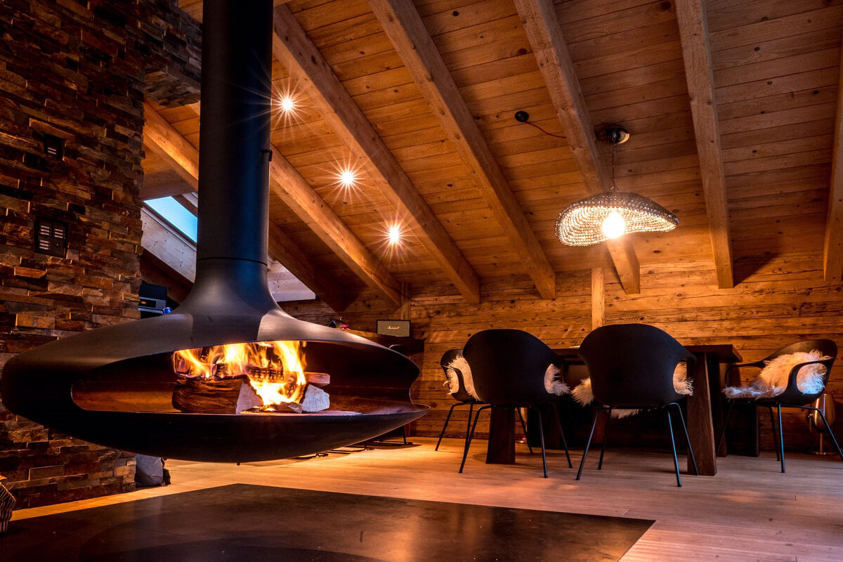 Upstairs there is a large dining area which can seat 8-10 people with comfort. This area opens out onto the living area with a 360 degree open fire, TV, DVD and floor to ceiling windows which take in the full glory of the imposing Matterhorn. The kitchen on the other side is open to the dining area, this is fully equipped with all the modern appliances you could possibly need. On this floor there is also the master bedroom with en-suite shower and wc. In the chalet guests also have access to a wellness area with a large relaxation room, Jacuzzi bath and Bio Sauna. This spa area can be accessed from the communal area or from the master bedroom.