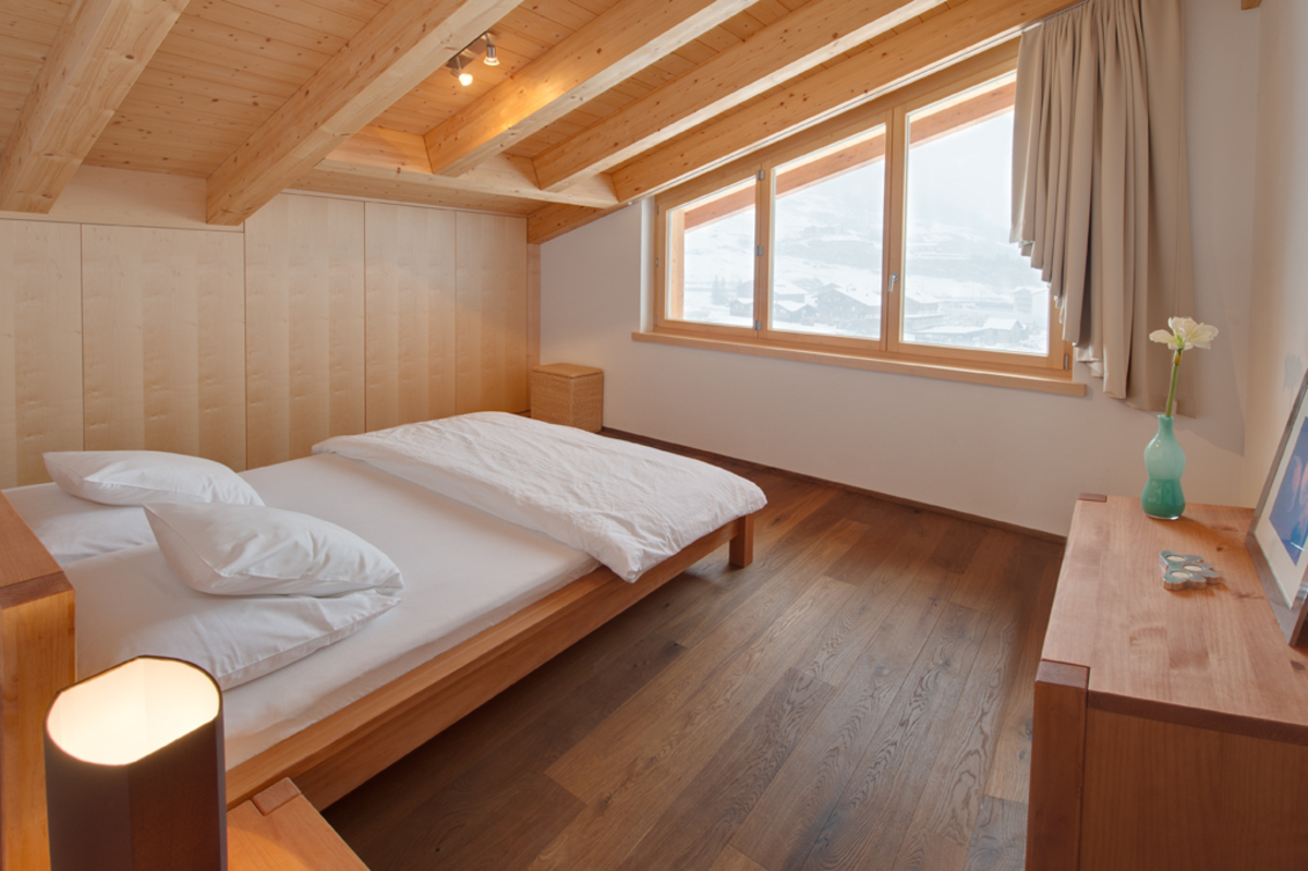 The Zora Penthouse effortlessly combines luxury with a modern alpine feel. All of the ceilings here have lovely wooden beams and the sloping aspect of these gives a cosy feel but at the same time giving a sense of space with the double height ceilings. This combined with the tall south facing windows makes this chalet a truly special place to spend a week away skiing.