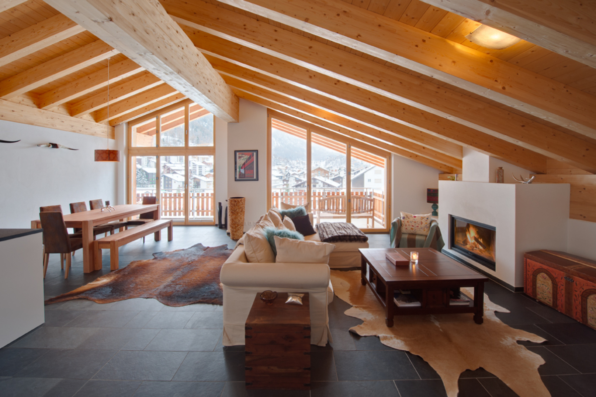 Chalet Zora Penthouse in Zermatt is a copy of its sister chalet, Zeus Penthouse which is just adjacent. The chalets are located really close to the main high street and even closer to the Sunnegga Express funicular which can take you up into the vast ski area in a matter of minutes. The Chalet Zora is on the top floor (with lift access) of this recently developed chalet building. As a result guests can enjoy excellent views over Zermatt and the imposing Matterhorn in the background. The chalet sleeps six people in three double bedrooms with two large bathrooms. Guests could even take the two chalets together to make up the entire top floor of this building and can sleep 12-14 guests. The apartment has 180 square metres of living space.