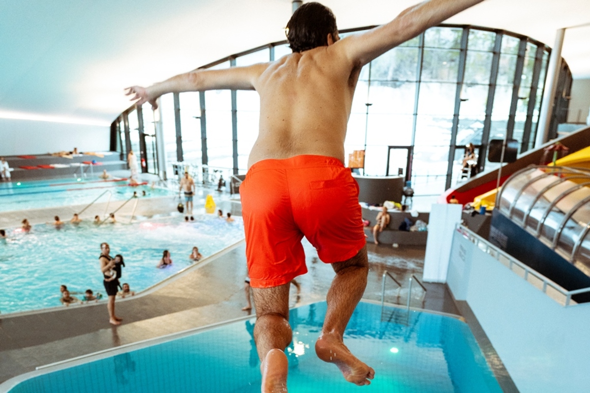 Reception, lounge, bar, 3 restaurants, children's club, ski shop and car parking. Private access to the Aquamotion centre with both family and adult areas; indoor and outdoor pools, diving pools, slides, sauna, steam room, Jacuzzi, salt cave, effervescent baths, gym, massage and various treatments are all available.