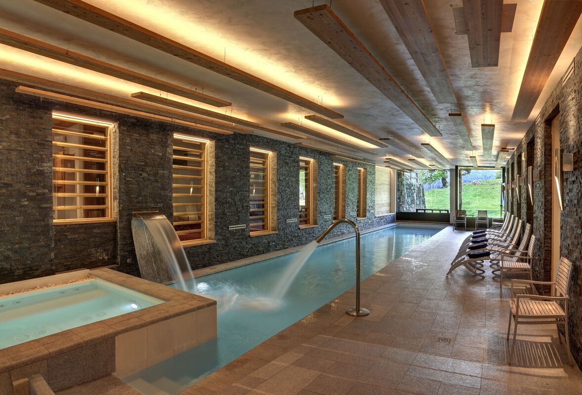 The Hotellerie de Mascognaz in Champoluc is owned by Paolo Vitelli. Given that Paolo also owns Azimut Yachts (manufacturing luxury motor yachts) it's fair to say that he is no stranger to creating beautiful, luxury interiors. This hotel is an incredible restoration of a small Walser hamlet dating back to the 14th Century which is located above the resort of Champoluc and only accessed by one of the hotel's many off-road vehicles. From the bottom of the home pistes and the main lifts it takes about fifteen minutes to reach the hamlet.